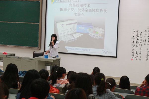 石洁老师首先介绍了公司有关食品检测仪器和食品安全检测的生化原理,重点阐明了酶联免疫、胶体金免疫层析技术的原理。在互动环节,石洁老师热情地为同学们解答了疑惑。