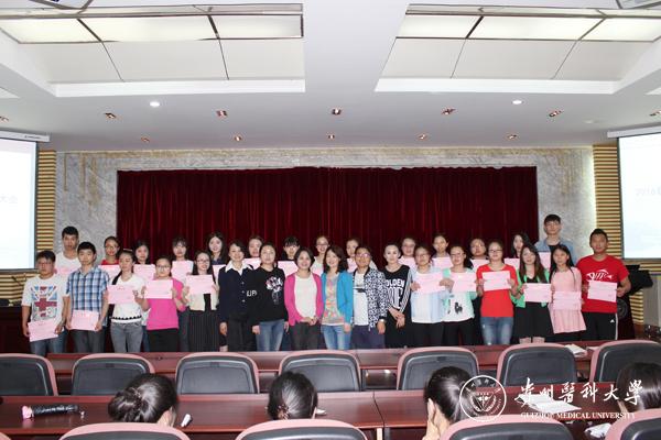杨英副书记发表讲话,她对同学们实习期间的积极表现给予了高度评价与充分肯定。尤其点名表扬实习中表现突出的同学,希望同学们在今后的学习工作中要“学会坚持,学会准备,学会思考”,要树立终身学习的理念,在工作实践中不断充实知识,增长才干。刘志燕副院长希望大家做好自我定位,珍惜结束实习回来的这段学习时光,备战好各种考试。并宣读了杜慧等19名临床优秀带教老师名单和杨倩等26名优秀毕业实习生名单,并表示衷心的祝贺!