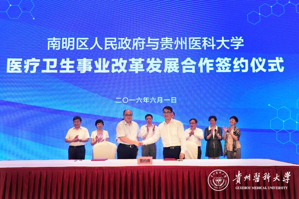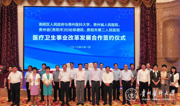 为大力促进南明区医疗卫生事业改革发展,进一步提升医疗卫生为民服务能力,6月1日下午,南明区人民政府与永利官网长期战略框架协议签约仪式在贵阳市花果园文化艺术中心二楼会议室隆重举行。贵州省卫生计生委副主任张光奇,贵阳市副市长刘玉海,南明区区委书记朱丽霞,南明区区委副书记、区长张海波,永利官网党委书记林昌虎、副校长罗鹏、党委办公室主任陈颖、校医院院长兼贵安新区大学城社区卫生服务中心主任唐学杰等参加。签约仪式由南明区区委副书记田胜松主持。