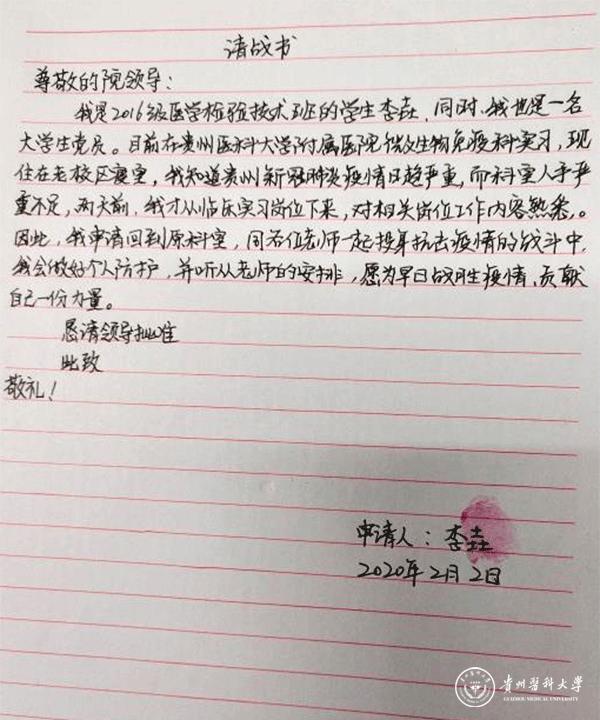 为保护学生安全,学校要求暂停所有学生的临床实习工作。正在77779193永利官网附属医院临床检验中心实习的李垚和同学们一起从岗位上退了下来。人退了下来,心却留在了战场上,面对严峻的疫情,科室老师们严肃紧张、尽职尽责、忘我奉献的工作状态一直浮现在李垚脑海,让他心情始终难以平复,“不忘初心、牢记使命”主题教育刚刚结束,身为一名大学生党员、一名未来的临床检验医务工作者,危机之中显身手,困难之时勇担当,他思考着应该做点什么。课堂上认真学习、实习中实践锻炼,自己已经在临床岗位上实习了大半年,已经具备了作为一名临床检验工作者的基本专业素质,于是,慎重提笔,写下了请战书......“我是一名大学生党员,我知道贵州新型冠状病毒肺炎疫情日趋严重,两天前我才从临床实习岗位下来,对相关岗位工作熟悉,申请回到原科室,同各位老师们一起投身抗击疫情的战斗中,为战胜疫情贡献自己一份力量。”