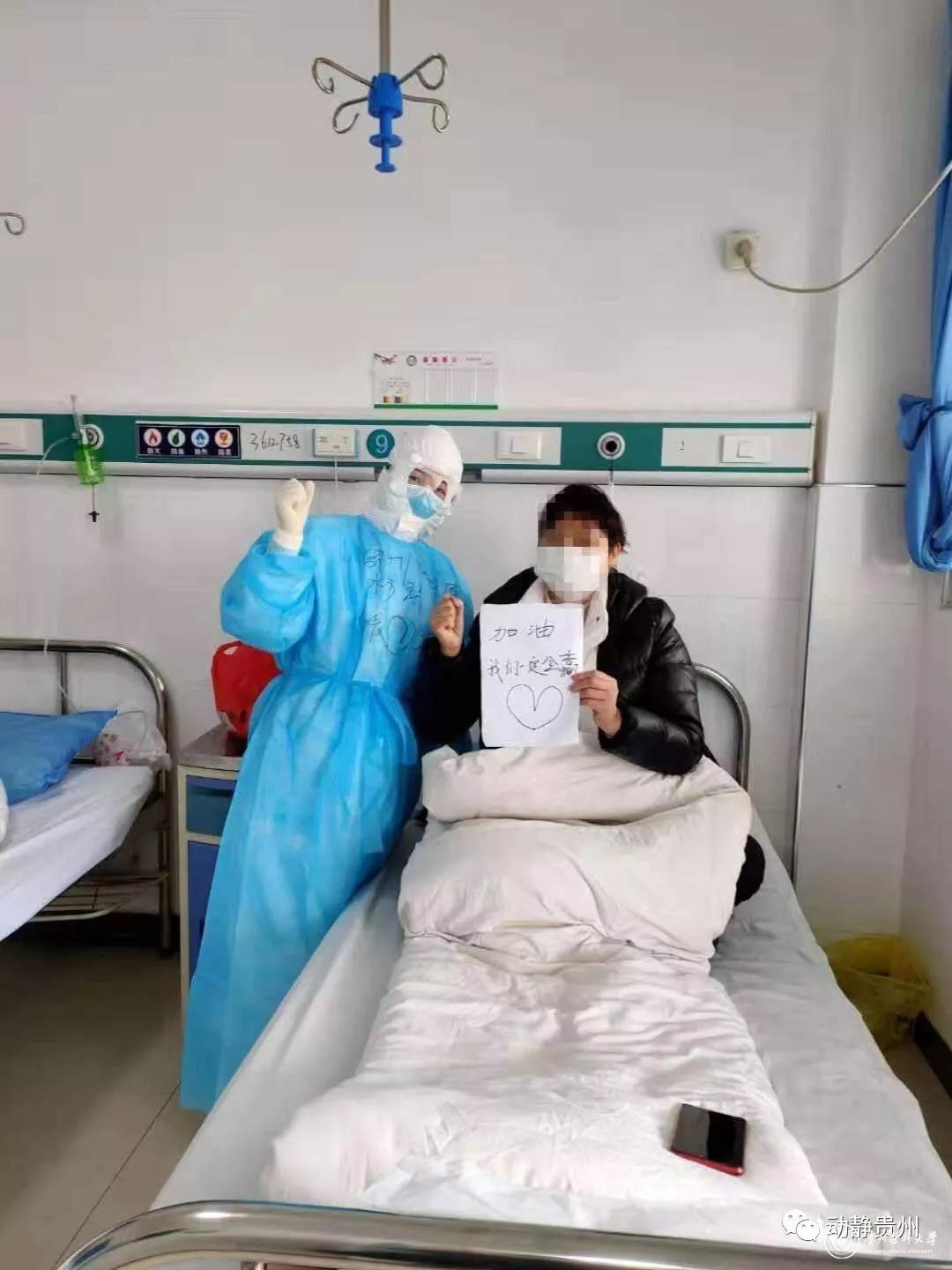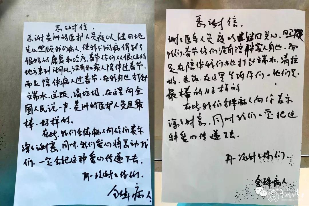 感谢贵州的医护人员夜以继日地关心、照顾我们病人,使我们的病得到了很好的康复和治疗。春节你们从很远的地方来到湖北,没有和家人陪伴过春节,而是陪伴病人过春节,在我身边打针、端水、送饭、清垃圾。在这里向全国人民说一声:贵州医护人员是最棒的,好样的。