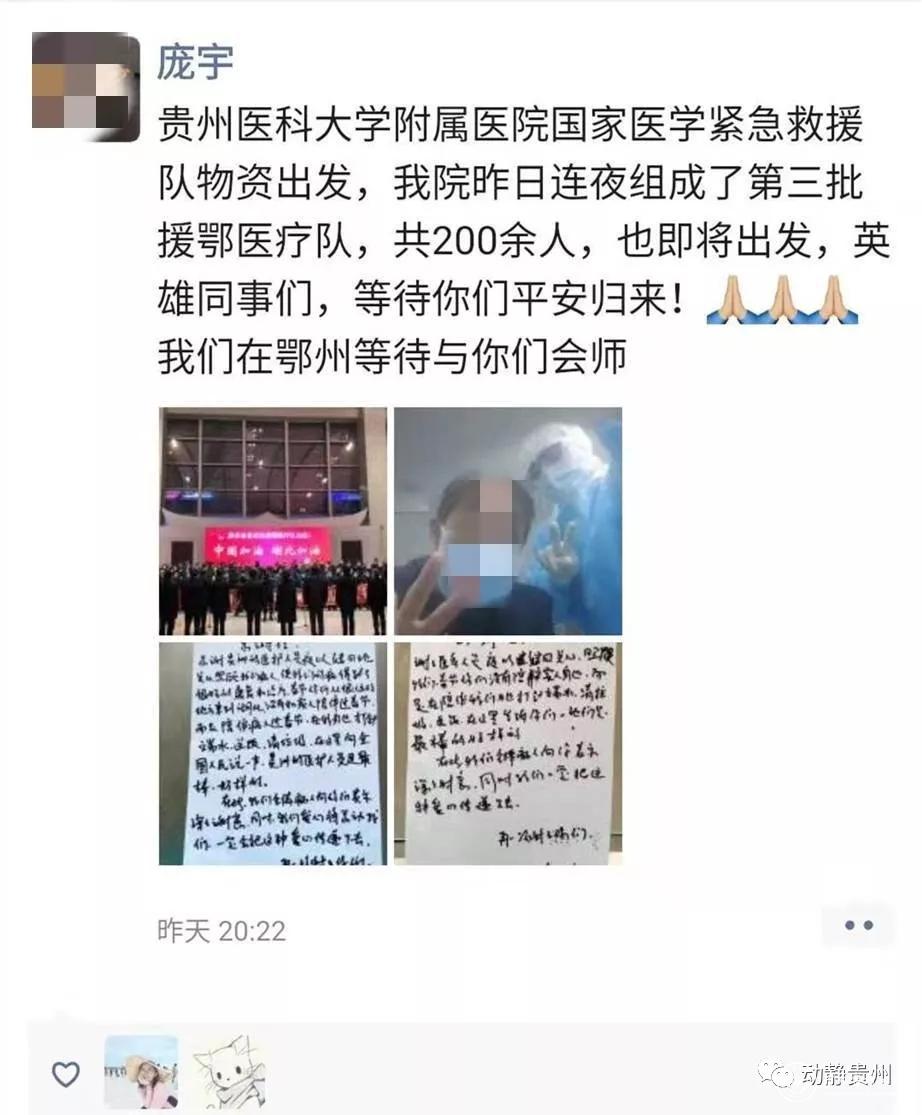 这是记者在贵州省首批援鄂医疗队队员庞宇的朋友圈看到的一封感谢信,写信的是正在接受贵州援鄂医疗队救治的当地新冠肺炎患者,收信的是全体贵州援鄂医疗队队员。