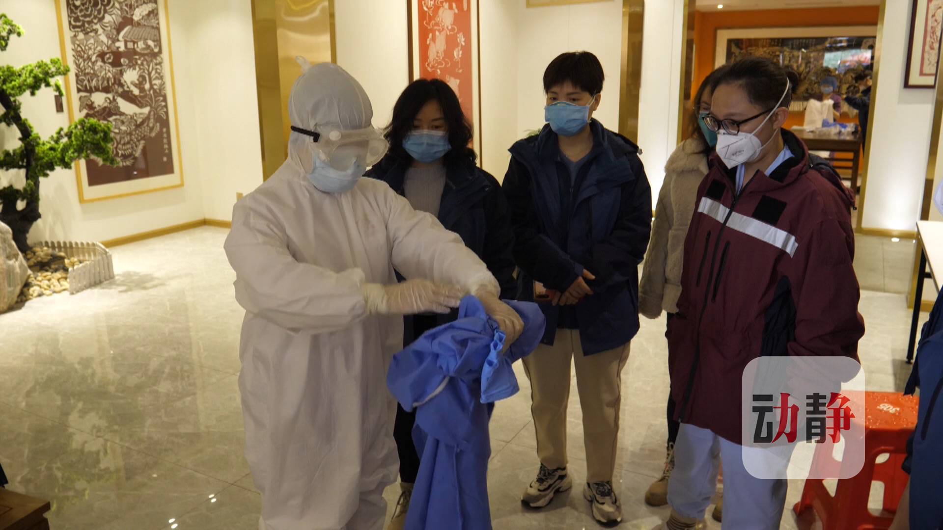 “你像这样,把帽子这边抓住翻过来”,贵医附院综合ICU的护士王军在旁边支招。他所在科室有同事在贵阳救治过新冠肺炎患者,所以他们总结出了一些防护服的穿脱经验。