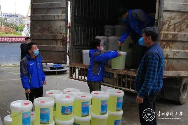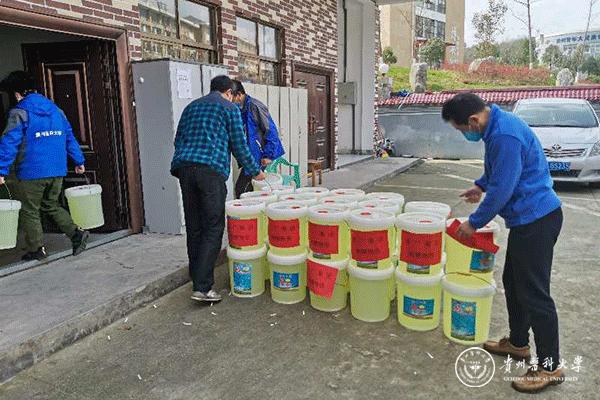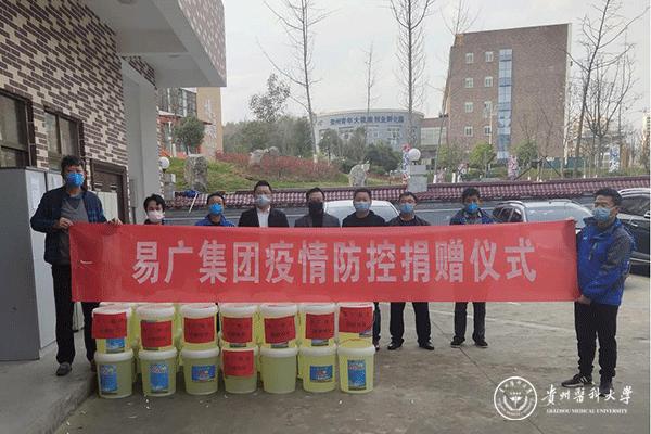 自新型冠状病毒肺炎疫情发生以来,疫情防控物资紧缺,口罩、84消毒液等物品很难购买。2月15日,贵州易广建设集团调动各方资源购买了1吨84消毒液捐赠给永利官网,贵州易广建设集团副总经理曹文毅、后勤管理处(后勤集团)副处长吴陵江、贵安新区大学城管委会办公室副主任郑维俊、贵安新区大学城管委会建发部负责人徐军、维修服务中心工作人员参加了捐赠仪式。
