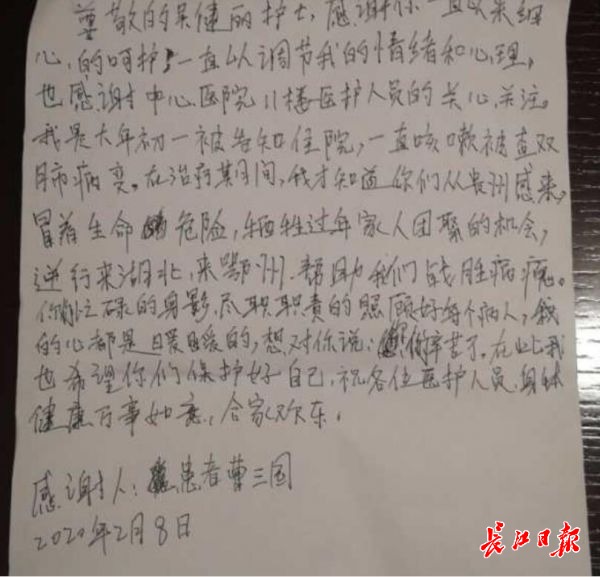 2月8日,吴建丽收到了一封来自患者曹三国的感谢信。曹三国在信中这样写道:“在治疗期间,我才知道你们从贵州感(赶)来,冒着生命危险,牺牲过年(和)家人团聚的机会,逆行来湖北,来鄂州,帮助我们战胜病魔。你们忙碌的身影,尽职尽责的照顾好每个病人,我的心都是暖暖的,想对你说:‘你们辛苦了。’”