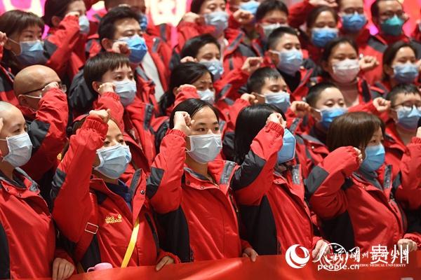 贵州省第七批援鄂医疗队出征现场,全体队员庄严宣誓。武敏 摄