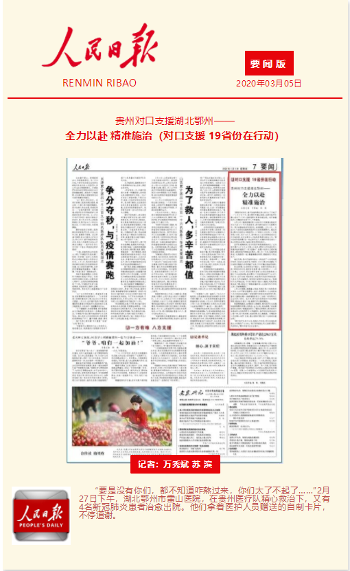 “贵州医疗队到了以后,短短几天时间,我们的重症率就从34%降到了22.68%。我们非常感谢,所以说贵州鄂州,风雨同舟。”鄂州市委书记王立表示。