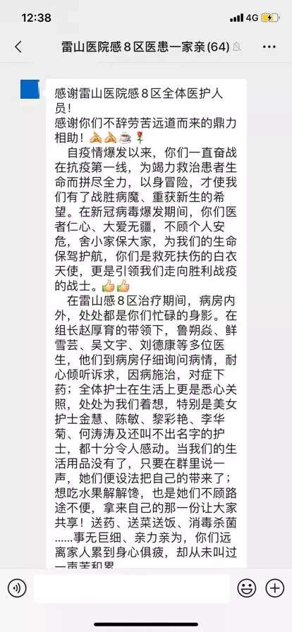 从八病区成立到现在,已经出院十几位患者,每名患者出院的时候大家都特别高兴、激动,特别是6床曾阿姨出院的时候给我们写了一封长长的感谢信,在三八节也发来祝福的短信,我真是觉得这是一份很光荣的使命,披上了白大衣,我们就是战士,为了保卫病人而自豪!