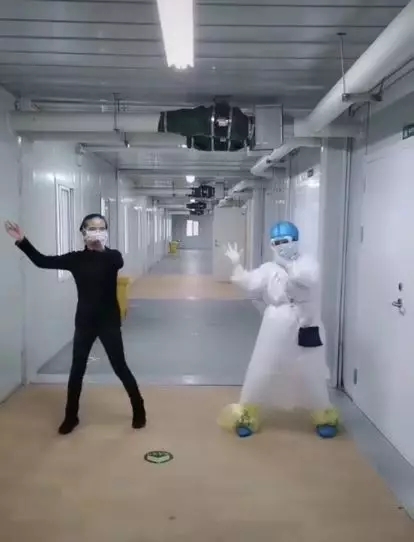 由于我们接收的都是轻症、普通型的患者,在忙碌之余,我们也想办法让病人活动活动身体。最开始是我们带着动一动,后来他们自发组成了一个队伍,在早饭及晚饭之后锻炼一下身体,还选出了组织委员和体育委员,真是很有爱的一个病区啊!
