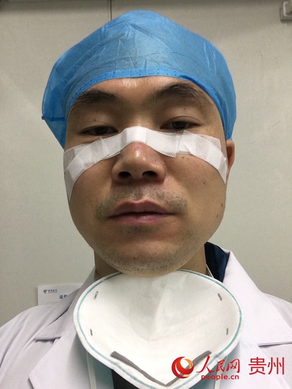 长时间佩戴防护口罩,吴世友鼻梁及脸颊出现压疮,只能用输液贴进行保护。受访者供图
