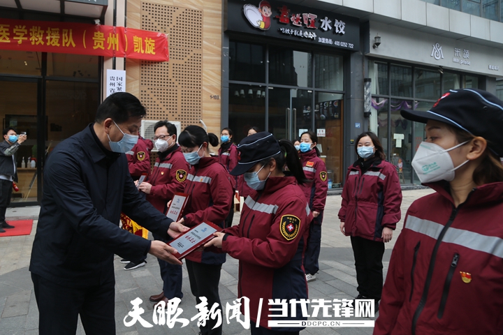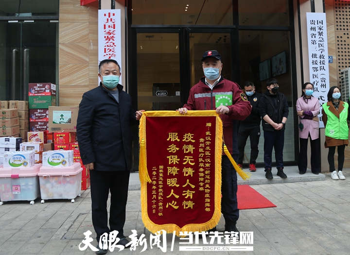 当天下午,队伍所在的武汉开发区(汉南)新冠肺炎防疫指挥部再次到住地看望队员们,并送来了锦旗和“白衣卫士”纪念牌,以此向队员们表示最崇高的敬意和最诚挚的感激。队员们同时向指挥部回赠了一面锦旗,感谢当地政府、群众对贵州医疗队伍的关心支持。