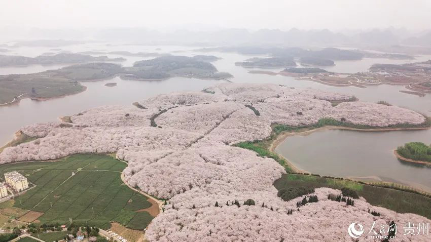 三月,贵安樱花园的万亩樱花盛开,将黔中大地装扮得如云似锦。贵安樱花园占地面积约15平方公里,坐落于高原明珠红枫湖畔,高峰山脚。这里种植着70余万株名贵樱花,曾被外媒誉为“蓝色星球最美的樱花园”之一。