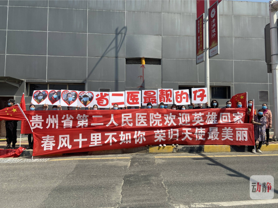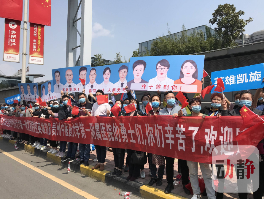 当天中午,贵州援鄂医疗队队员乘坐大巴车前往集中隔离点。在车辆途经贵阳城区路口的时候,贵阳市民自发鸣笛,迎接凯旋车队,向英雄们表达了内心的激动与感激之情,只为告诉他们——欢迎回家!