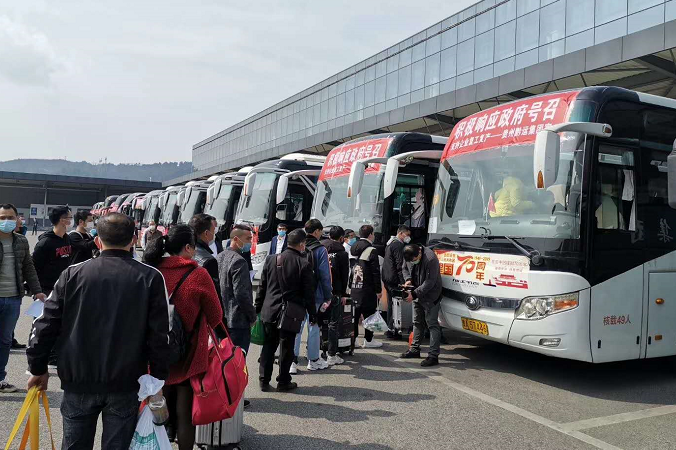 对于外出务工人员,贵州贴心的“包车”“包机”服务,安全送老乡们回到自己的工作岗位,截至3月6日,全省通过农民工包车向广东、福建、浙江、江苏等省输出农民工突破10万人。
