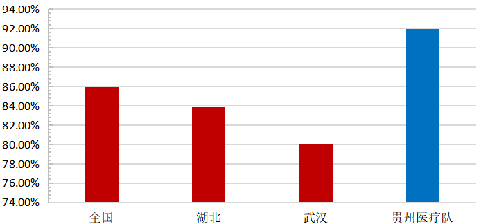 数据显示,贵州省援鄂医疗队进驻后,我省管理病人治愈率高于全国和湖北平均水平。截至3月17日,全国治愈率为85.92%,湖北省为83.90%,武汉市为80.06%,贵州医疗队为91.96%。