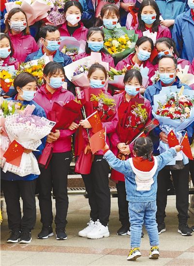 图为在欢迎仪式现场,一个小女孩手持国旗,向医务人员致意。乔启明摄(影像中国)