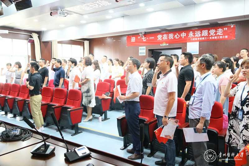 为庆祝中国共产党成立99周年,回顾党的光辉历程,讴歌党的丰功伟绩,进一步激发党员活力、爱国信念,增强广大党员的光荣感、使命感,引导广大党员干部更加热爱党、拥护党,继承和发扬党的光荣传统,同时激励党员立足本职岗位创先争优,以饱满的工作热情,庆祝党的生日,6月29日,口腔医学院教工一支部精心组织策划了迎“七一 党在我心中 永远跟党走” 主题党日活动。活动在老药学楼学术报告厅举行,口院党政领导班子成员出席活动,教工一支部全体党员、全院发展对象以及2-7月入党党员参加活动。活动由教工一支部组织委员张黎蓉主持。