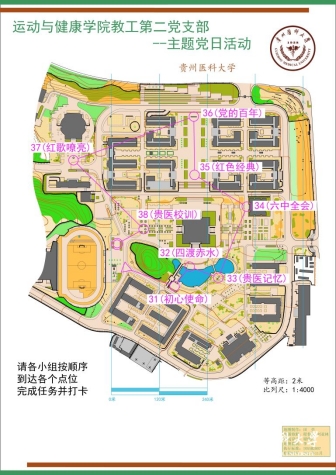 本次“主题活动”分别设置了八个打卡点,第一个打卡点为 “初心使命”,意在让全体党员同志再一次坚定自己作为共产党员的初心使命;第二个打卡点“四渡赤水”因地制宜的借用了人工湖,让各位同志体验革命先辈们长征的艰辛;第三、四个打卡点“红色经典”“党的百年”,打卡答题检验了教工二支部的同志们对党史知识的学习成效;本次活动通过答题的方式学习十九届六中全会精神。活动中还设计了打卡老校门牌楼和重温贵医校训,提高大家对党、国家、工作岗位的热爱。
