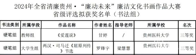 近日,由省纪委机关、省委教育工委、省监察委员会和省教育厅共同举办的2024年全省清廉贵州“廉动未来”廉洁文化书画作品大赛省级评选结果揭晓。永利官网运动与健康学院甘婷老师创作的作品《爱莲说》荣获教师组硬笔书法三等奖,2023级基础医学院临床医学专业罗锋宇同学创作、梁慧慧老师指导的作品《两汉·司马迁《屈原列传》节选》荣获大学生组硬笔书法三等奖。