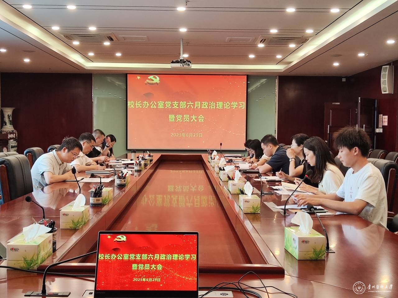 6月29日,校长办公室党支部在知雨楼六楼开展了政治理论学习暨党员大会。校党委副书记、校长罗鹏以普通党员身份参加,会议由支部书记孙西凌主持。