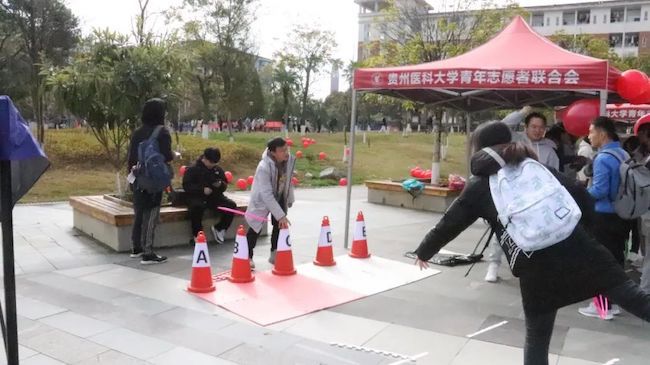 一圈一套,便是一条法律知识;一抬一扔,便是一个法治校园。“法律知识套套乐”五彩斑斓的套圈是青春的贵医学子,那一个个小桩象征着法律的巍然不动,套圈向桩子靠近就如同贵医学子向着法律靠拢。