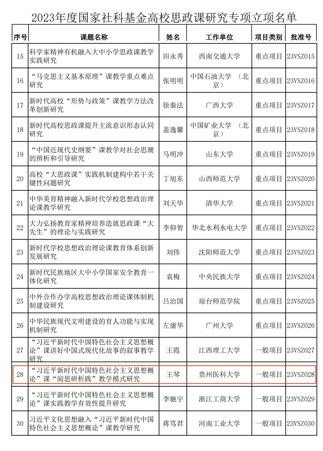 12月22日,全国哲学社会科学工作办公室公布了2023年度国家社科基金高校思政课研究专项立项名单,全国共批准立项171项,其中贵州省获批3项。永利官网马克思主义学院王琴副教授申报的《“习近平新时代中国特色社会主义思想概论”课“阅思研析践”教学模式研究》(项目编号:23VSZ028)获批立项,这是自2019年设立国家社科基金高校思政课研究专项以来,永利官网首次获得该专项课题。