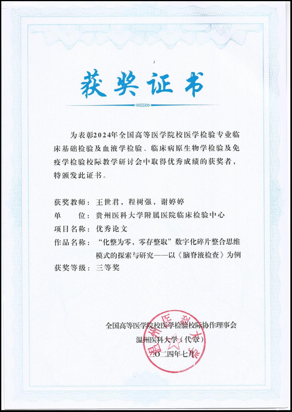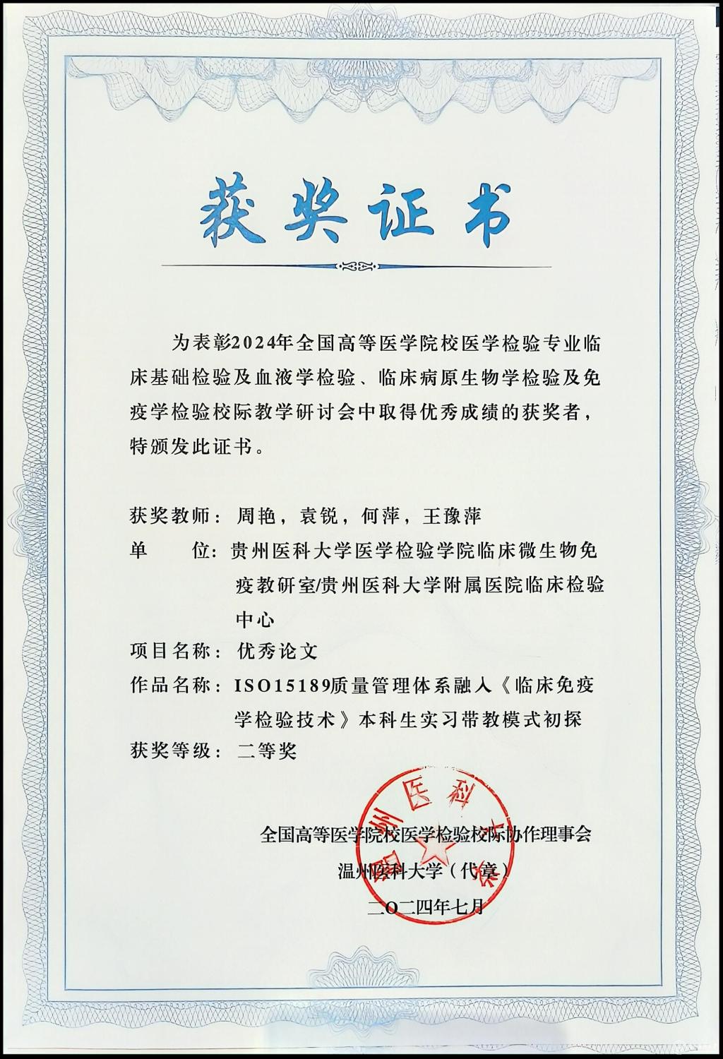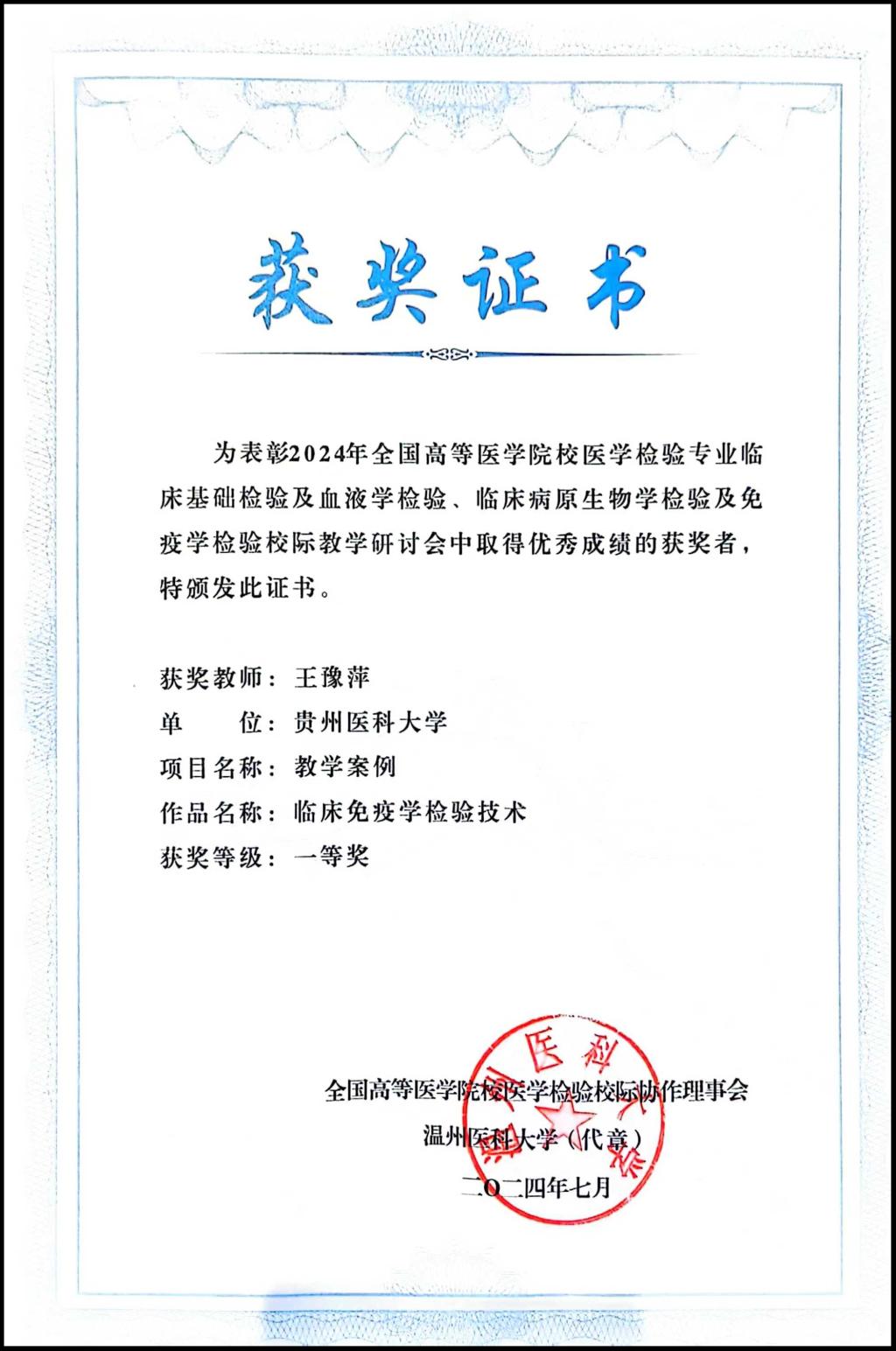 永利官网教师王豫萍教授的教学案例“《临床免疫学检验技术》—感染性疾病及其免疫学检测”荣获教学案例组比赛一等奖;周艳老师的论文“ISO15189质量管理体系融入《临床免疫学检验技术》本科生实习带教模式初探”荣获优秀论文二等奖;王世君老师的论文“化整为零,零存整取”数字化碎片整合思维模式的探索与研究——以《脑脊液检查》为例”荣获优秀论文三等奖。
