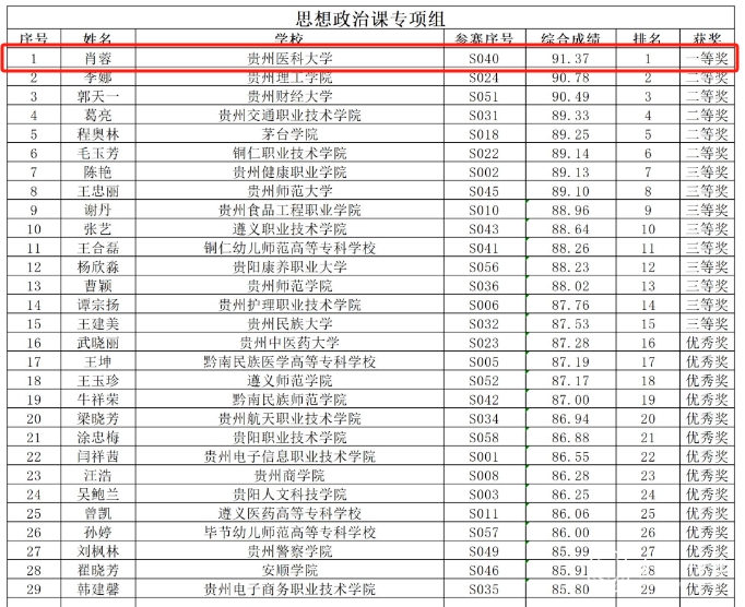 近日,2024年贵州省高校青年教师教学竞赛获奖名单公布,永利官网马克思主义学院肖蓉荣获思想政治课专项组一等奖(全省第一名),基础医学院王璐荣获医科组二等奖(全省第二名),公共卫生与健康学院邱燕燕荣获工科组三等奖。肖蓉将代表贵州省,参加2024年第七届全国高校青年教师教学竞赛。