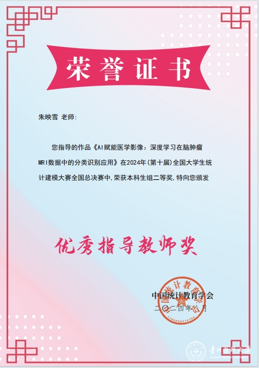 8月21日至23日,2024年第十届全国大学生统计建模大赛决赛答辩在西安财经大学举行,永利官网生物与工程学院(健康医药现代产业学院)数据科学与大数据技术教研室教师朱映雪老师指导,裴陈彬、杨青松、黄可欣三位同学组成的参赛队经过激烈角逐,获得全国二等奖的好成绩,也是永利官网在该项赛事中取得的首次突破。同时,朱映雪老师获得全国优秀指导教师奖。