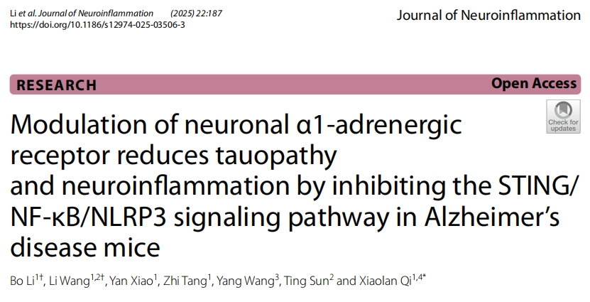 近日,永利官网分子生物学重点实验室齐晓岚教授团队在《Journal of Neuroinflammation》期刊(中科院一区TOP期刊,影响因子10.1)发表的研究论文《Modulation of neuronalα1-adrenergic receptor reduces tauopathy and neuroinflammation by inhibiting the STING/NF-κB/NLRP3 signaling pathway in Alzheimer's disease mice》,揭示并阐明alpha1肾上腺素能受体在阿尔兹海默病的病理过程中扮演的重要角色和具体的分子机制。