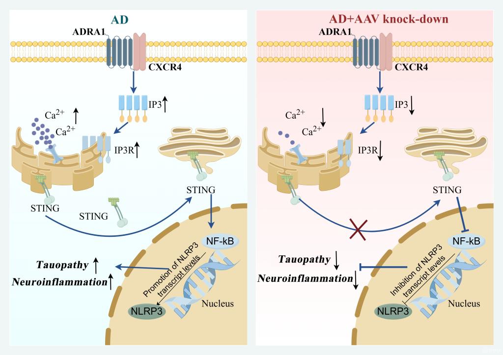 本研究以3xTg-AD小鼠作为研究对象,侧脑室注射腺相关病毒调控脑组织中神经元ADRA1的表达,系统性分析了敲低3xTg-AD小鼠大脑神经元中ADRA1的表达后能够有效减轻AD病理特征并恢复神经元结构与功能,从而改善AD小鼠的学习记忆能力。分子机制研究发现,ADRA1与趋化因子(C-X-C基序)受体4(C-X-C chemokine receptor type 4,CXCR4)相互作用形成异源二聚体,通过增加内质网上肌醇1,4,5-三磷酸受体(Inositol 1,4,5-Trisphosphate Receptor,IP3R)的表达从而引起内质网钙离子耗竭造成胞质钙离子超载,进而激活STING/NF-κB/NLRP3信号通路诱导炎症因子释放增多。研究揭示了ADRA1通过调控神经炎症从而影响AD进程的新机制,以期为预防与治疗AD的相关策略制定和药物研发提供一个潜在关键靶点。