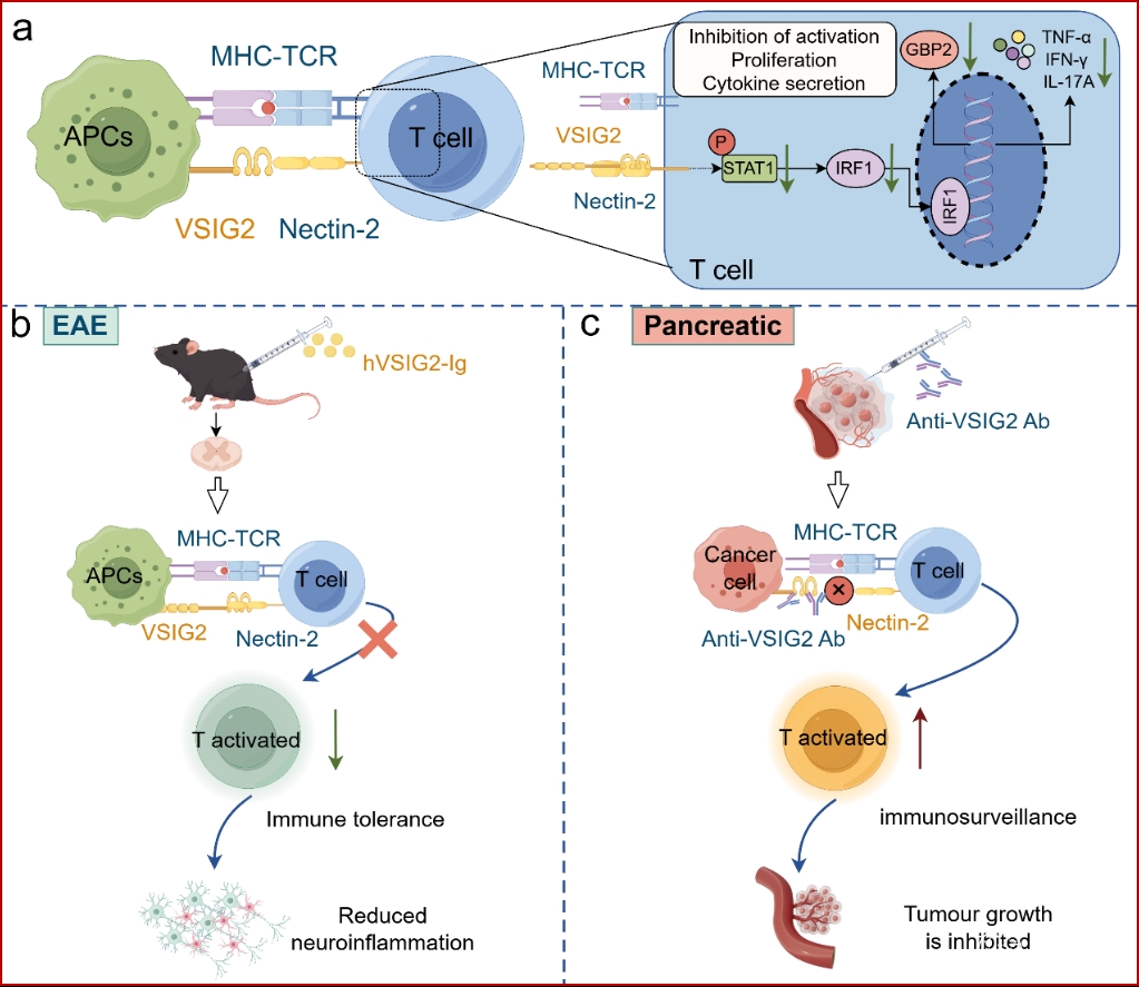 尽管B7家族免疫检查点分子(如PD-L1/PD-1)改善了癌症和自身免疫病的治疗,但是由于免疫检查点分子表达的异质性,导致疗效有限,理论上,找到所有的免疫检查点分子有望治愈各种癌症及自身免疫病。本研究发现并鉴定出一种新的免疫检查点分子VSIG2,其在活化的抗原提呈细胞(APCs)以及胰腺癌上高表达,可与T细胞表面Nectin-2分子结合,起到抑制T细胞反应,治疗实验性自身免疫性脑脊髓炎的作用;而用抗VSIG2的单克隆抗体和抗Nectin-2单克隆抗体可阻断VSIG2和Nectin2分子的结合,激活T细胞反应,从而起到治疗胰腺癌的作用。同时,VSIG2与Nectin-2的相互作用可以通过调控T细胞中下游的STAT1/IRF1/GBP2信号途径,从而影响T细胞反应。该研究创新性发现并阐明VSIG2-Nectin-2的配受体相互作用作为新免疫检查点的功能和机制,为癌症和自身免疫病的免疫治疗提供了全新靶点和策略。