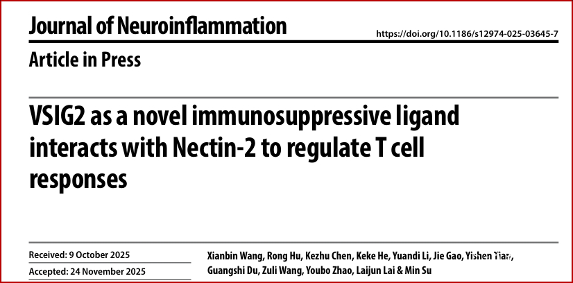 近日,永利官网组织工程与干细胞实验中心和转化医学研究中心科研团队在《Journal of Neuroinflammation》期刊(中科院一区TOP期刊,影响因子10.1)发表研究论文《VSIG2 as a novel immunosuppressive ligand interacts with Nectin-2 to regulate T cell responses》,发现并鉴定了新的免疫抑制配体VSIG2在自身免疫病和肿瘤免疫治疗中的关键作用及分子调控机制。